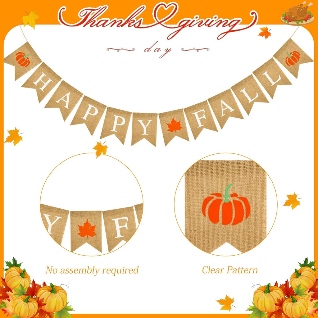 【Celebrate the Season】Embrace the warmth and beauty of autumn with our Happy Fall Burlap Banner. Featuring charming pumpkins, maple leaves, and turkey designs, this banner is perfect for adding a festive touch to your Thanksgiving and fall celebrations.