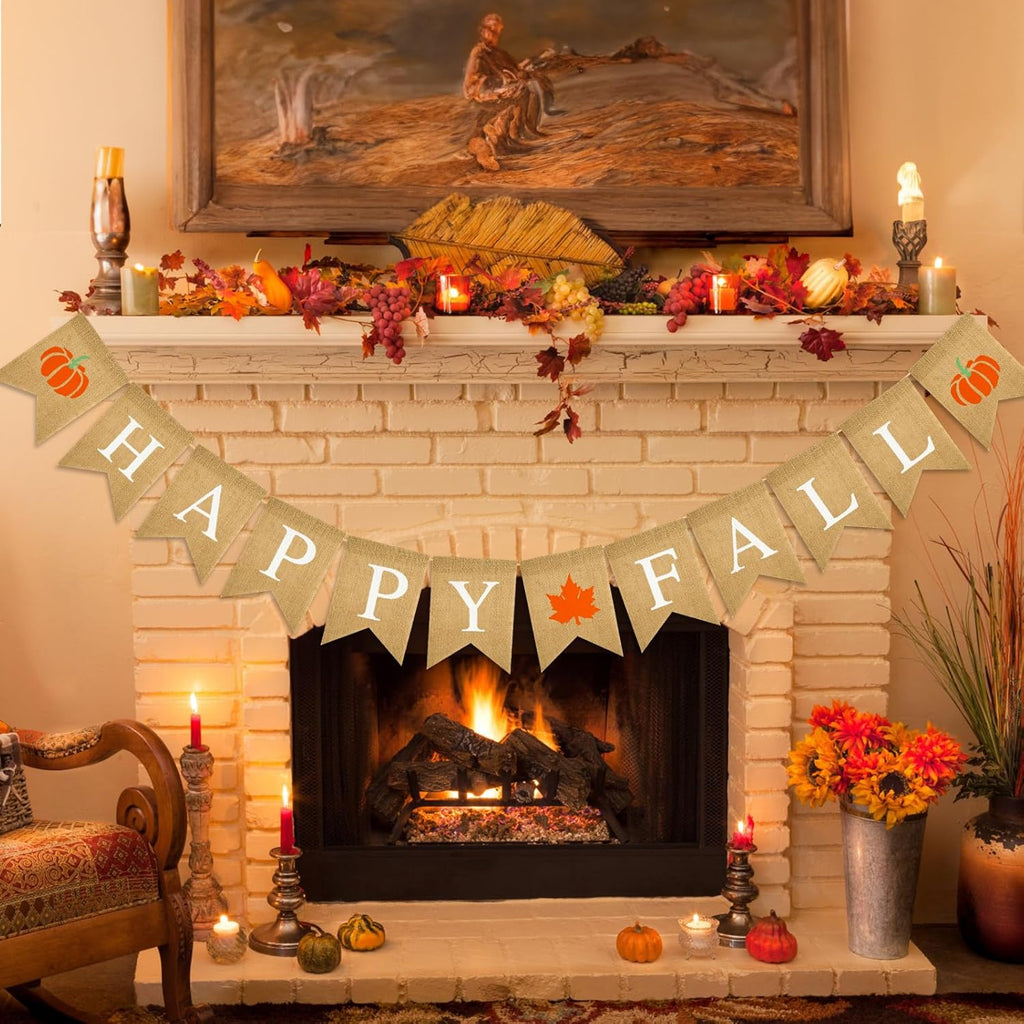 jijAcraft Happy Fall Burlap Banner - Thanksgiving & Harvest Home Decor, Pumpkin Maple Leaf Garland, Fireplace Hanging Decoration