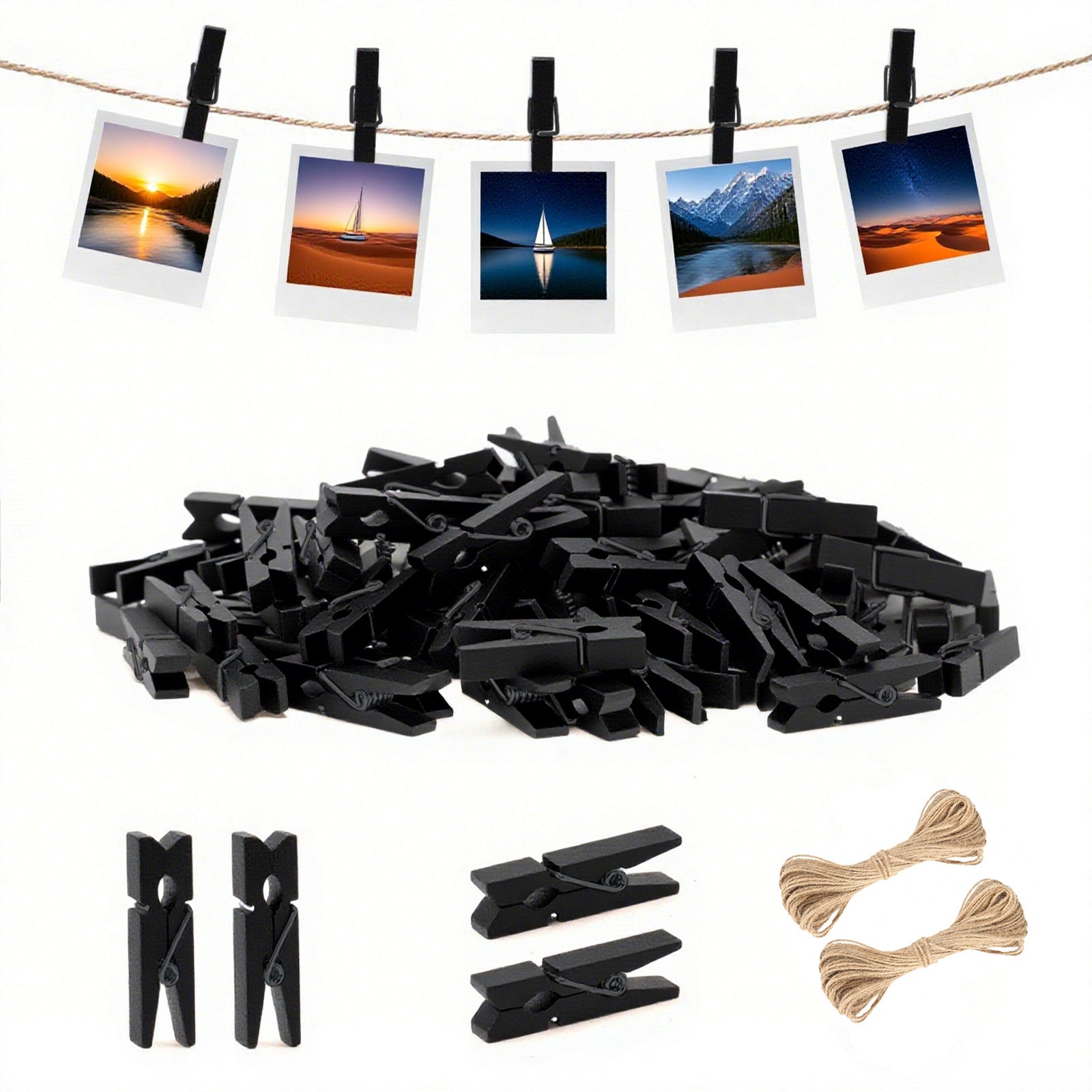 [Black Clothespins] - Package includes 100pcs small photo clips with 2pcs twine, the size of the photo hanging clips is 1.38 x 0.4 x 0.2inch/3.5 x 0.9 x 0.6cm, and the total length of the twine is 66Ft/20M, there are enough quantity and sizes suitable for your photo hanging.