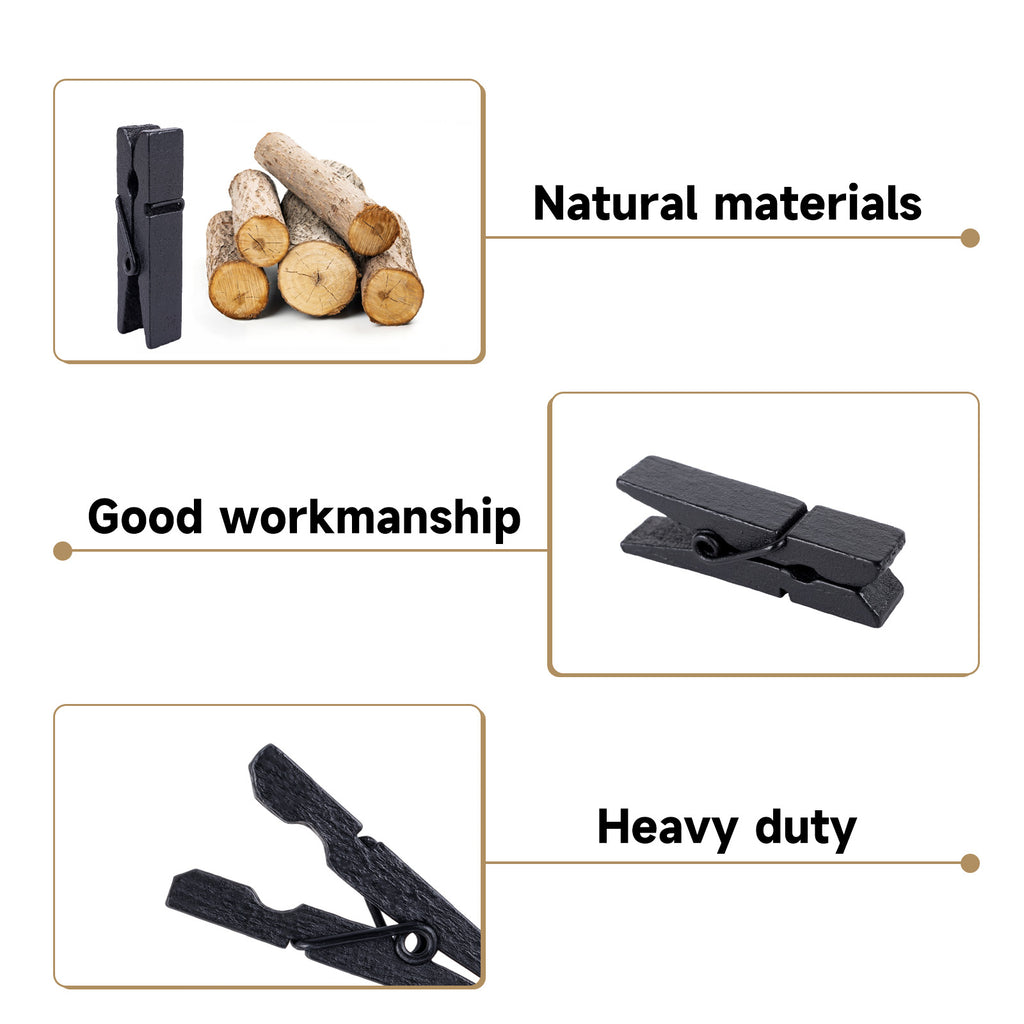 jijAcraft Mini Clothespins with String - 100Pcs Black Wooden Clothes Pins, Small Photo Hanging Clips, Craft Clips for Picture, Cocktails Decor, Baby Shower, Wedding