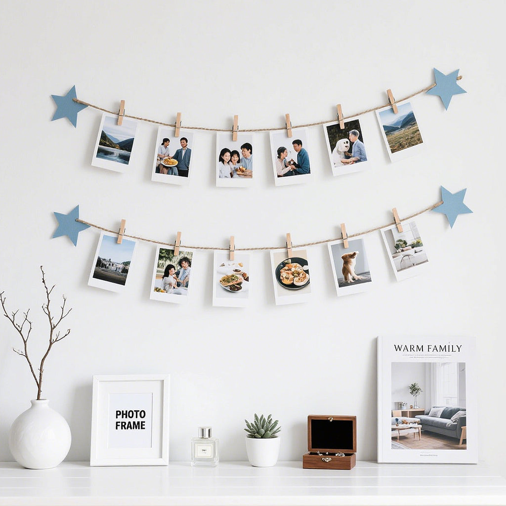 [Photo Clips with String] - The twine can be freely cut for weaving, crafts, bundling and packaging, etc., the baby shower photo display clips have a strong bite, and with the twine can be used to hang photos, postcards, greeting cards, hanging small clothes, hanging small socks, etc., using the multi-purpose twine makes your photo display easier and more relaxing