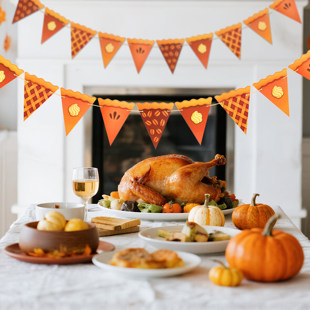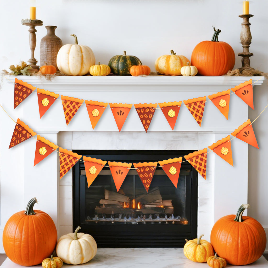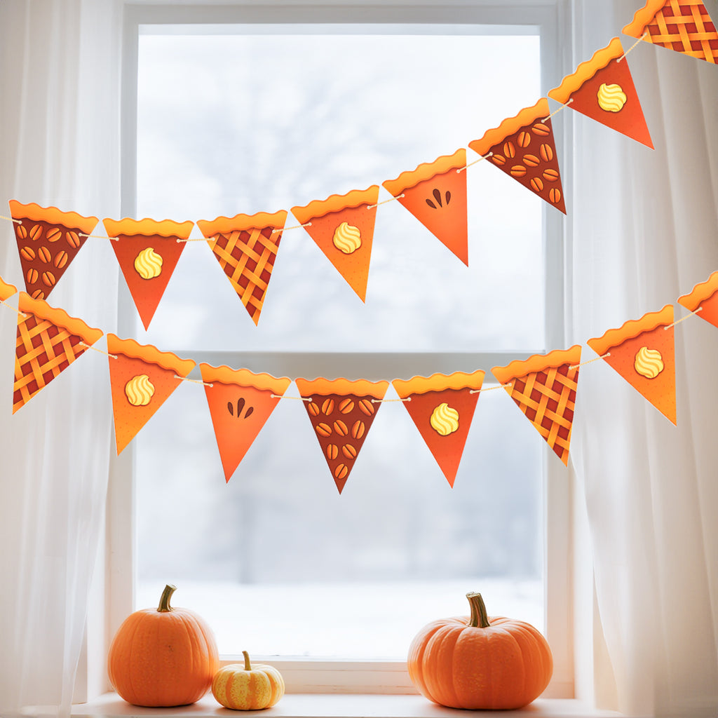 [Thanksgiving Pumpkin Pie Style] – Designed with a classic pumpkin pie triangle shape, each pennant features detailed prints like crust texture and rich filling colors. Whether used as Thanksgiving pumpkin party decor, autumn party garland, or included in harvest party decorations, it adds a warm and festive touch to your dining room, living space, or entryway.