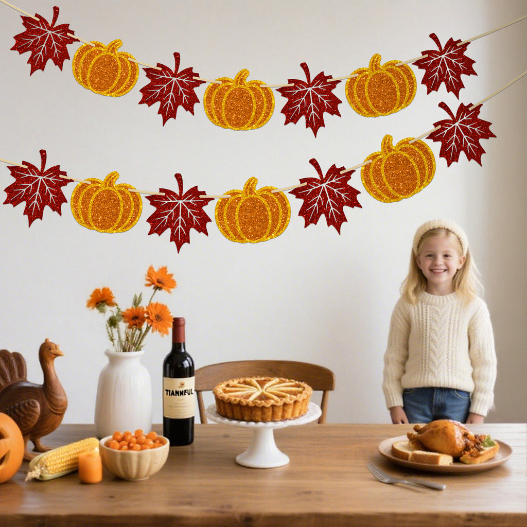 [Perfect for Kids' Spaces] – This pumpkin garland and maple leaf banner is a charming addition to kids' playrooms or nurseries during the fall season. The soft glitter and cute autumn banner shapes bring cozy warmth to your child’s space and make Thanksgiving more magical for little ones.