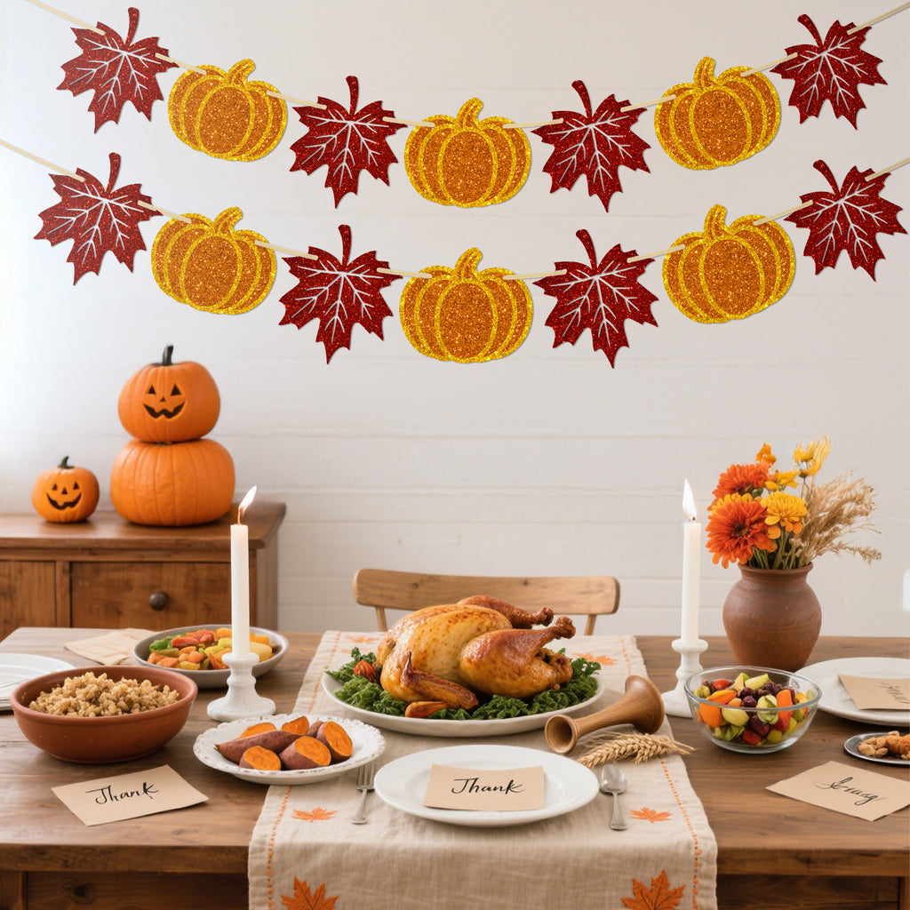jijAcraft Thanksgiving Pumpkin Banner – 2pcs Pumpkin and Maple Leaf Banner, Pre-Strung Fall Garland for Thanksgiving Party Supplies, Fireplace, Wall, Table, Classroom, Mantel Decor